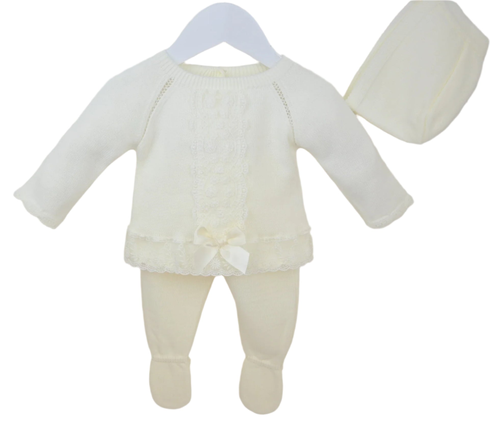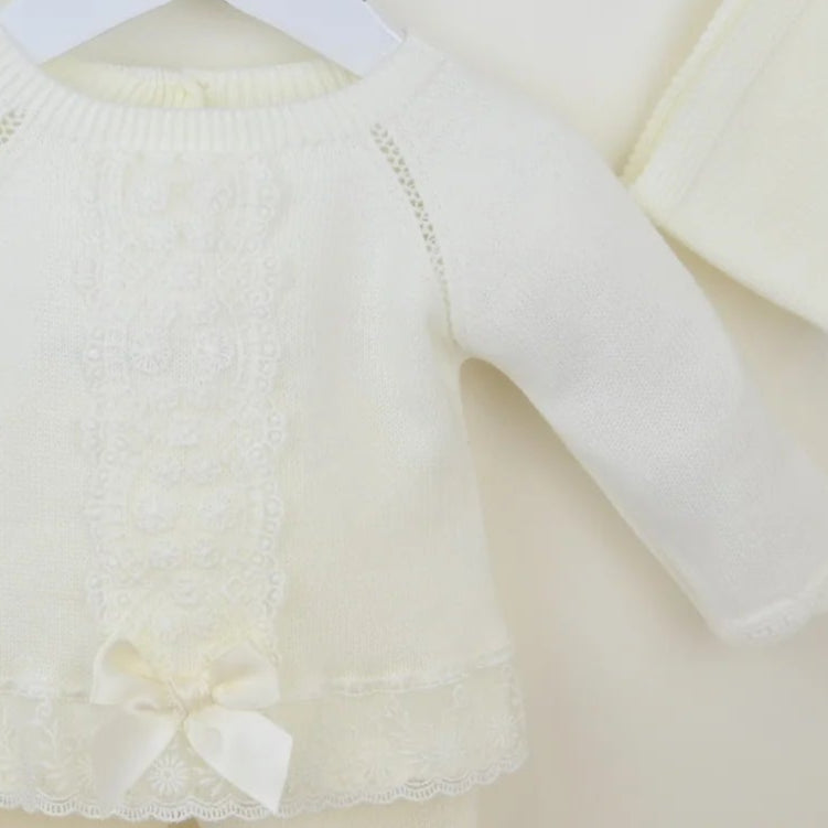 This charming two-piece baby outfit is crafted from a luxuriously soft ecru yarn. It features a delicate lace panel along the front and hem, accented by a sweet ribbon bow. The coordinating trousers offer an ultra-comfortable elasticated waist and snug enclosed feet. A matching bonnet completes this delightful set.