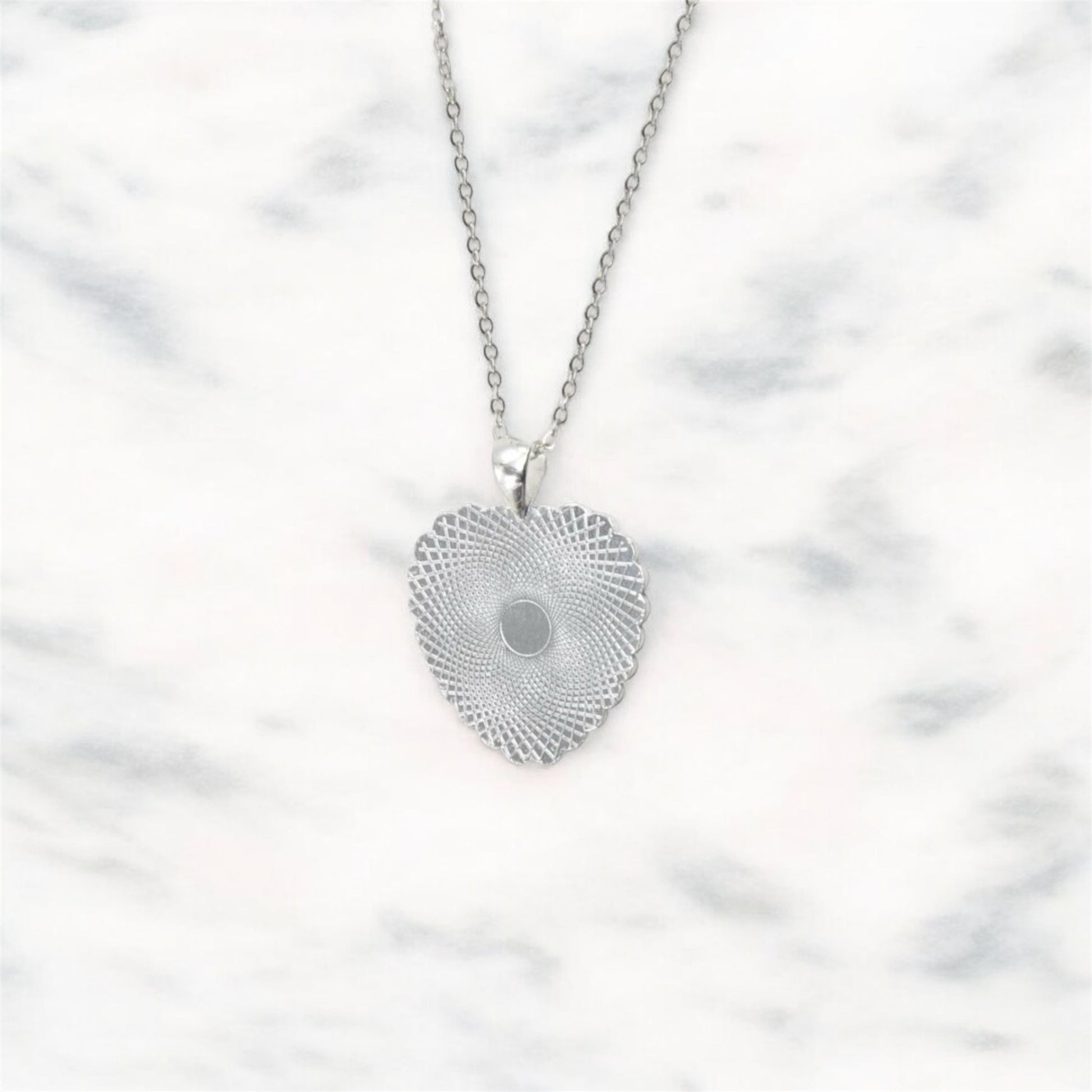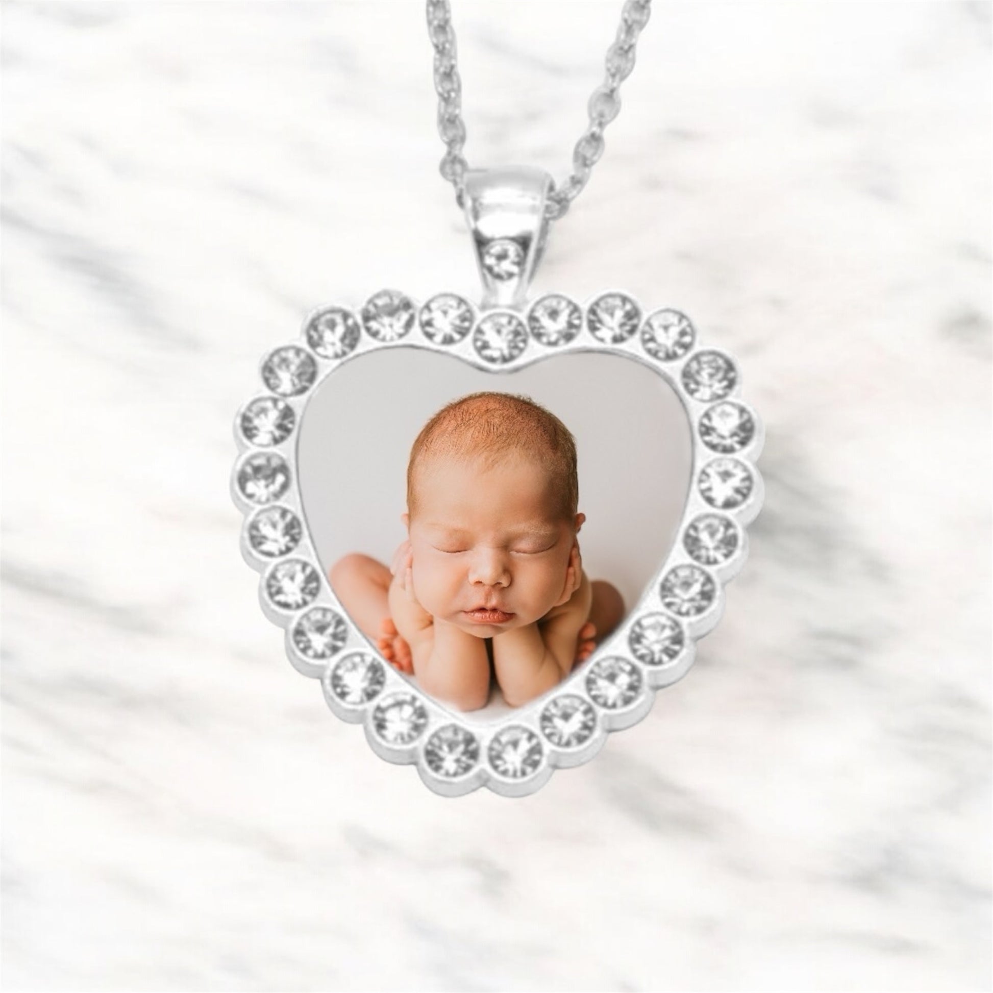 This personalised silver love heart necklace features a photo pendant, perfect for keeping your loved ones close to your heart. The reverse side showcases a beautiful pattern, surrounded by rhinestones for a touch of elegance. A unique and heartfelt gift for any occasion.